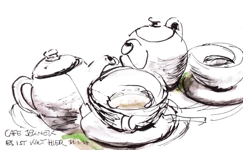 Erstmals waren wir diese Woche im Café Jelinek. Beim Fenster war’s leider etwas kühl – der urige, denkmalgeschützte Ofen stand wohl zu weit weg von uns. Trotz Personalmangel wurden wir alle gut versorgt. Das Café hat insgesamt unseren Beleuchtungs-, Essens- und Wohlfühltest bestanden, wir werden uns dort wieder mal zum Zeichnen treffen.