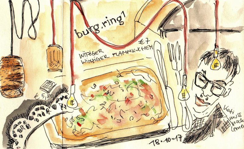 Für ein Bild ist darin noch Platz… Sandra hat mich auf die Idee gebracht ein Leporello mit verschiedenen Gerichten aus den verschiedenen Caféhäusern zu füllen. Wir haben das Cafe Raimann, Das Möbel, BurgRing 1, Cafe Halle, Cafe Jelinek, Vollpension, Cafe Prückel und das Cafe Tirolerhof besucht.