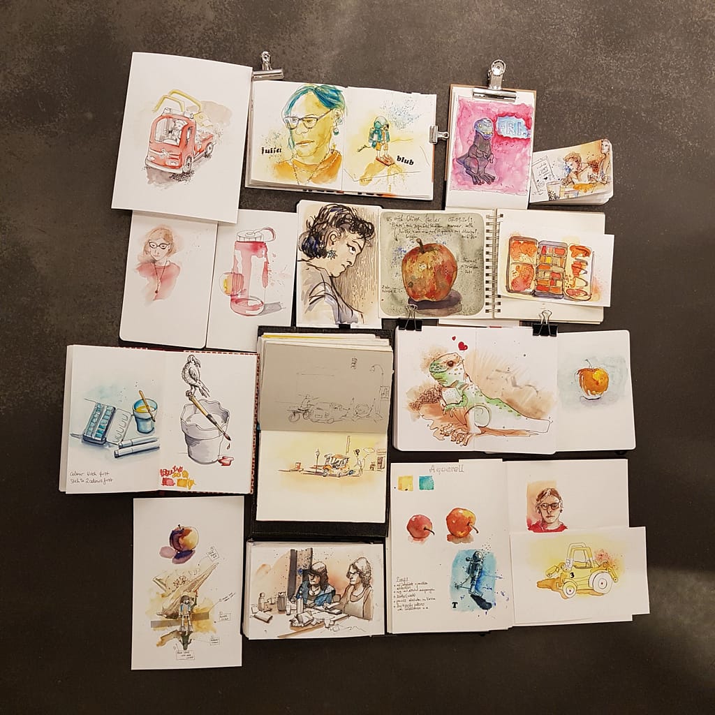 Unser erster gemeinsamer Tag startete mit Sketching und Aqrarell-Grundlagen. Oliver brachte Übungen mit, mit denen wir spielend-einfach unser Grundlagenwissen erweitern konnten.