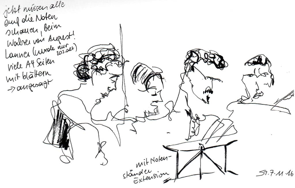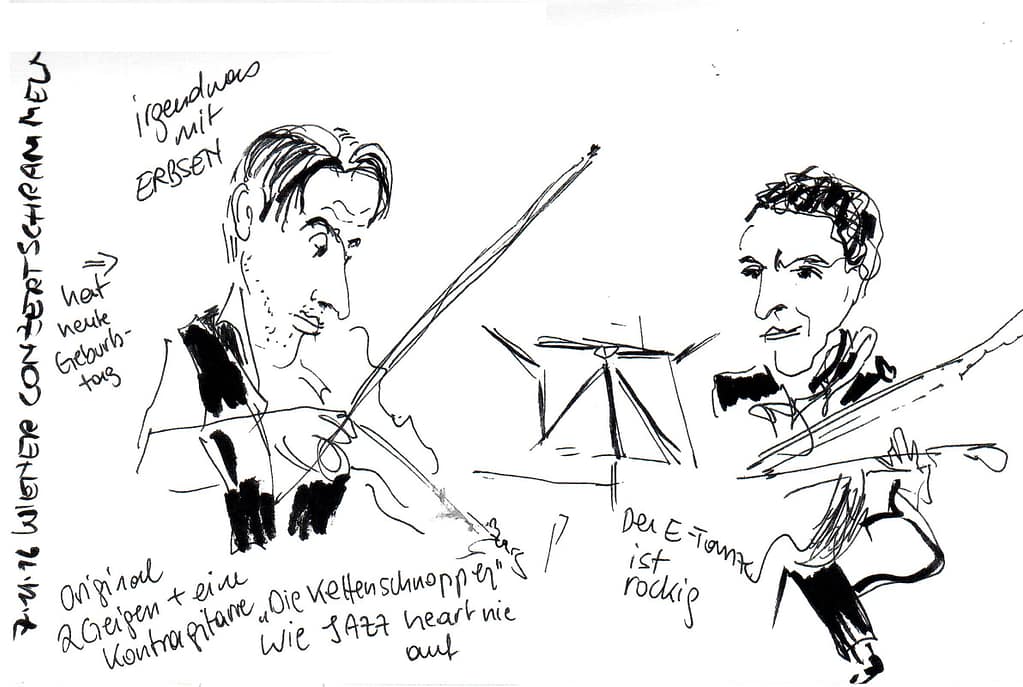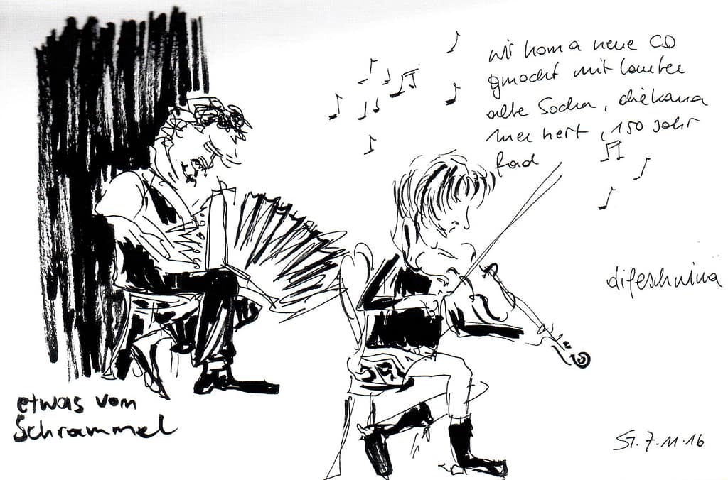 Jeden ersten Montag im Monat gibt es im Ottakringer Bockkeller ein Konzert mit den Neuen Wiener Concert Schrammeln. Bei dieser Musik lässt es sich beschwingt zeichnen.