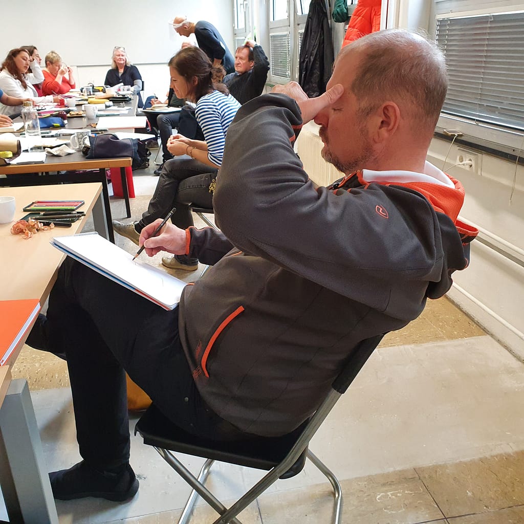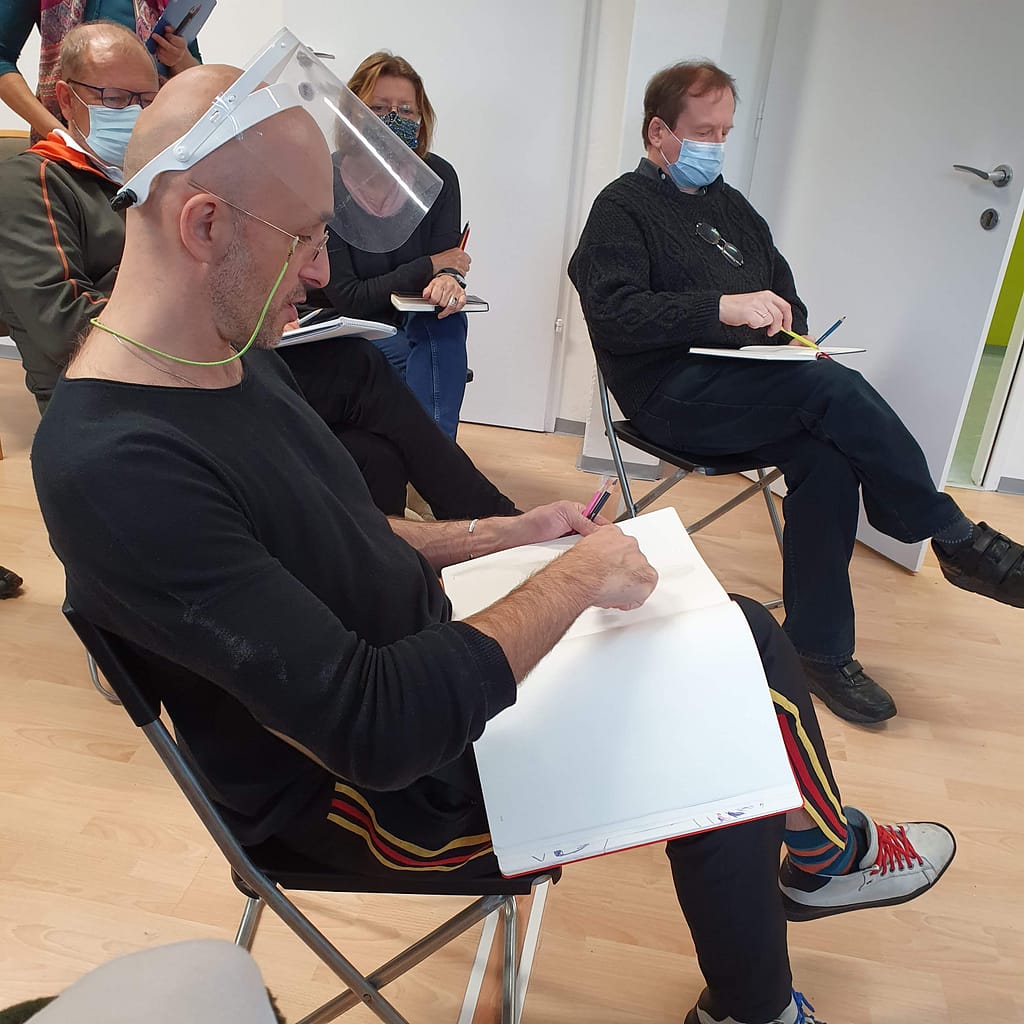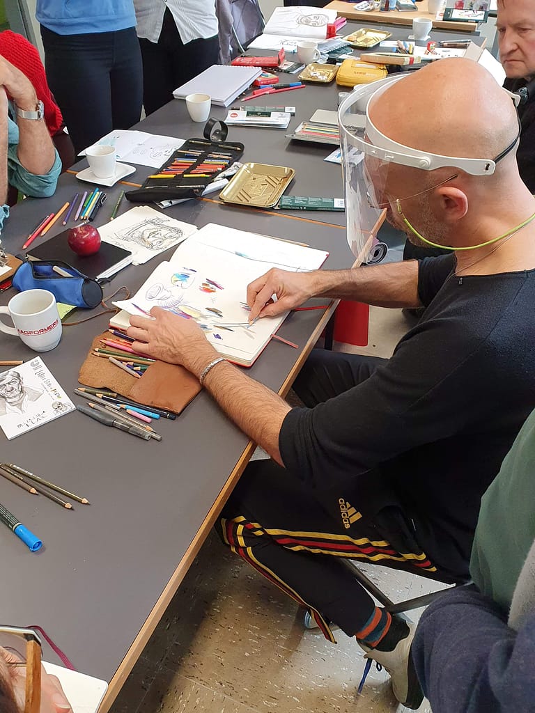 Am 17. und 18. Oktober 2020 trotzte Aljoscha Blau der Corona-Krise und flog nach Wien, um uns unter Einhaltung aktueller gängigen Sicherheitsmaßnahmen in seine Kunst des Portraitierens einzuweihen. Ausgestattet mit Skizzenbuch und Buntstiften verbrachten wir ein lehrreiches Wochenende, an dem er uns nicht nur versuchte, anatomische Grundlagen näher zu bringen.