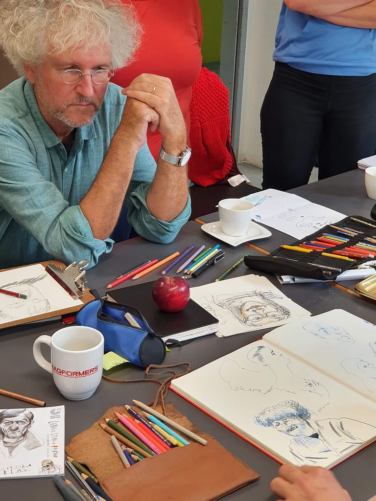 Die Hauptthemen der beiden Tage werden FigurPorträt und Mensch in der Umgebung. Wie bringe ich mein Verhältnis zu dem Modell zum Ausdruck? Worauf achte ich bei einem schnell skizzierten Portrait, damit die Ähnlichkeit bleibt? Und wie erzähle ich etwas über einen Menschen durch Darstellung seines direkten Umfeldes?