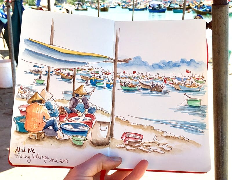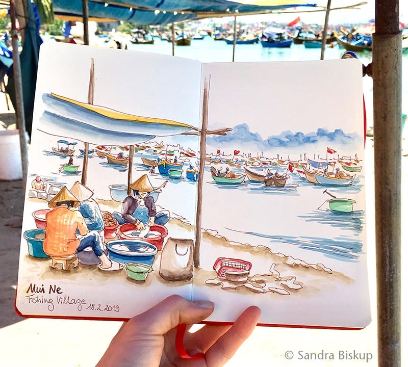 Jetzt, wo ich mir zuhause das Skizzenbuch meiner Reise durch Vietnam ansehe, erinnere ich mich wieder sehr gut an meine Gefühle in genau diesen Momenten, an die Gerüche in der Umgebung, an die heiße, schwüle Luft und die lauten Geräusche – sei’s von der Unzahl an Mopeds auf den Straßen oder von den lauten Rufen der Vietnamesen auf den Märkten. Neugierig?