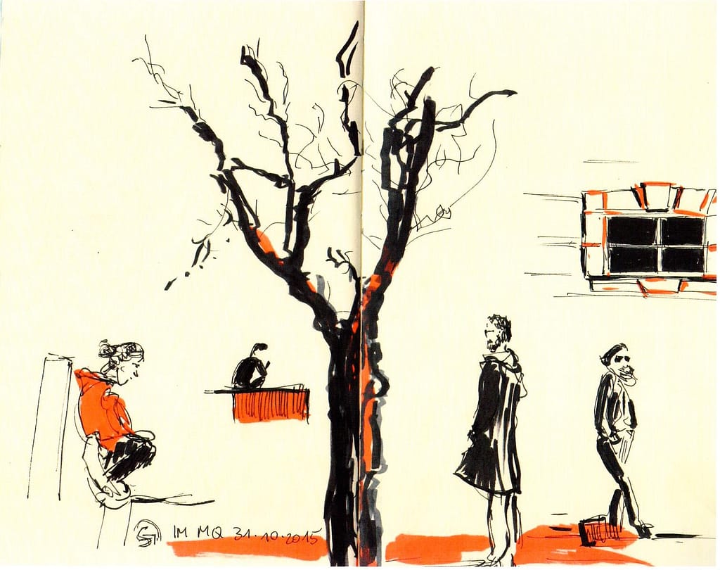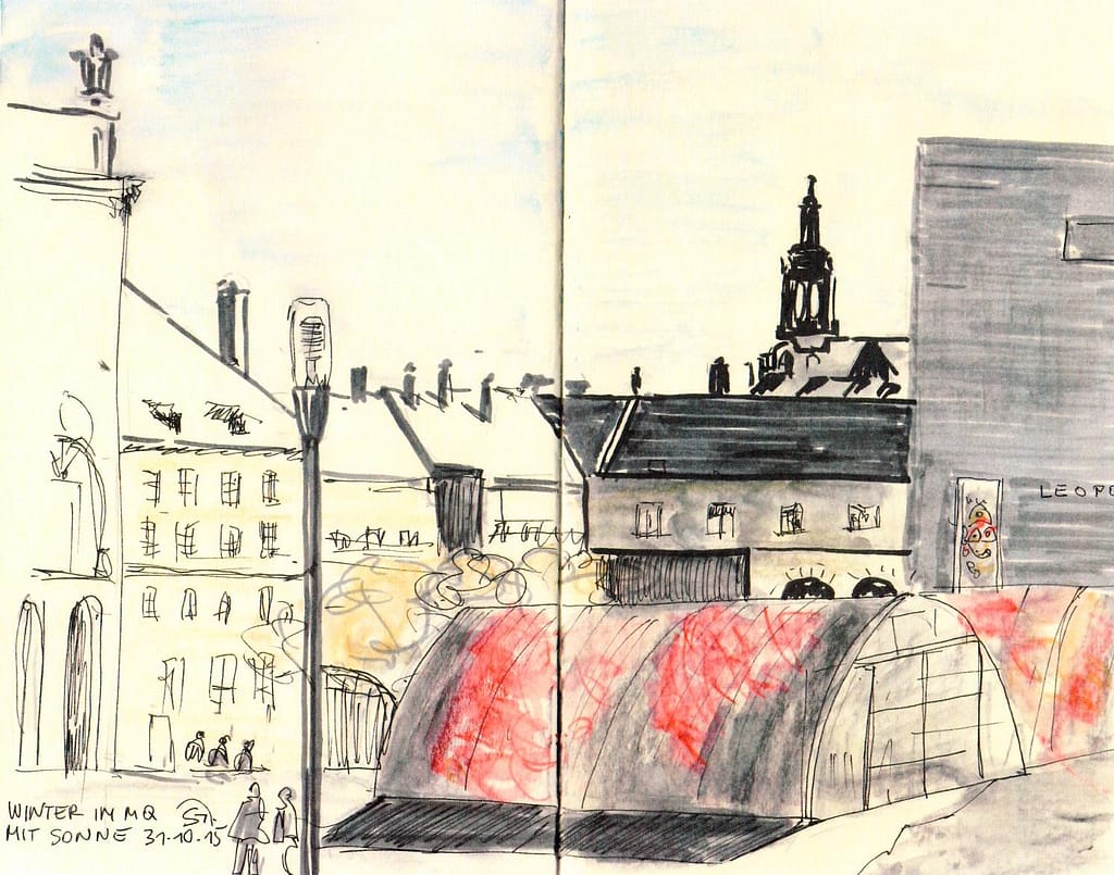 Die Sonne schien auf die Treppe des MUMOK und wir haben uns dort zum Zeichnen niedergelassen. Die Iglus für den Winter im Museumsquartier wurden schon aufgestellt.
