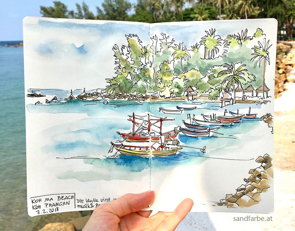 Mit Skizzenheft und Farben ausgerüstet war ich 3 Wochen in Thailand unterwegs. Reisen sind für mich immer herrlich inspirierend – aus dem Impuls heraus bleibe ich einfach dort stehen, wo mir die Szenerie gefällt. Dann nehme ich mir auch die Zeit und Ruhe, das Gesehene in meinem Skizzenbuch festzuhalten – egal, ob es um mich herum turbulent zugeht oder nicht.
