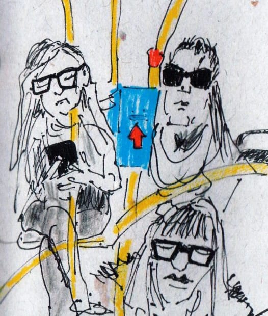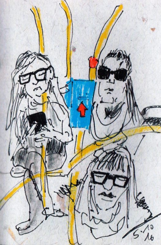 In einem Notizbuch, das mir eine Freundin aus Indien mitgebracht hat, habe ich meine Mitreisenden im neuen Bus zeichnerisch festgehalten.